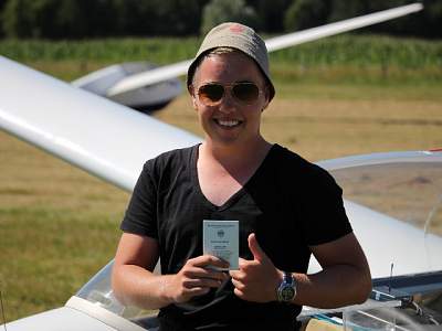 Auf Grund des schlechten Wetters zog sich die Ausbildung länger als gewöhnlich, aber nun hatte das Wetter endlich ein Einsehen. Nachdem sie einige Übungsflüge mit Ausbildungsleiter Arnd Deyerling absolviert hatte, wurde sie noch einmal von Fluglehrer Wilko Brayer überprüft. Danach startete sie zum ersten Mal allein in den ostfriesischen Himmel. Nach drei erfolgten Starts und Landungen mit dem Schuldoppelsitzer ASK-13 gratulierten die Segelfliger der Fluggruppe zur bestandenen A-Prüfung.