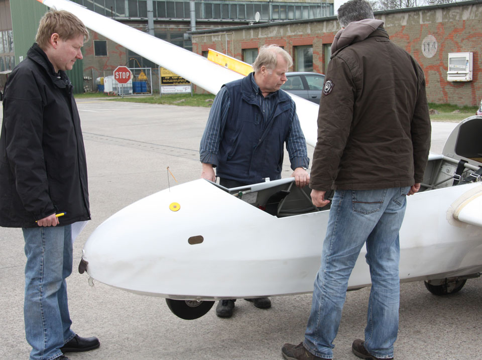 Zur wahrung der Flugsicherheit müssen alle Flugzeuge einmal im Jahr einer Überprüfung unterzogen werden. Dies erledigte unser Prüfer Gerhard am 17.03. mit dem Ergebnis, dass alle unsere Flugzeuge "in Schuss" sind. Auf dem Bild seht ihr wie Prüfer Gerhard und Uwe (Technischer Leiter Segelflug) unsere ASK13 begutachten. Peter (1. Vorsitzender) überwacht das ganze.