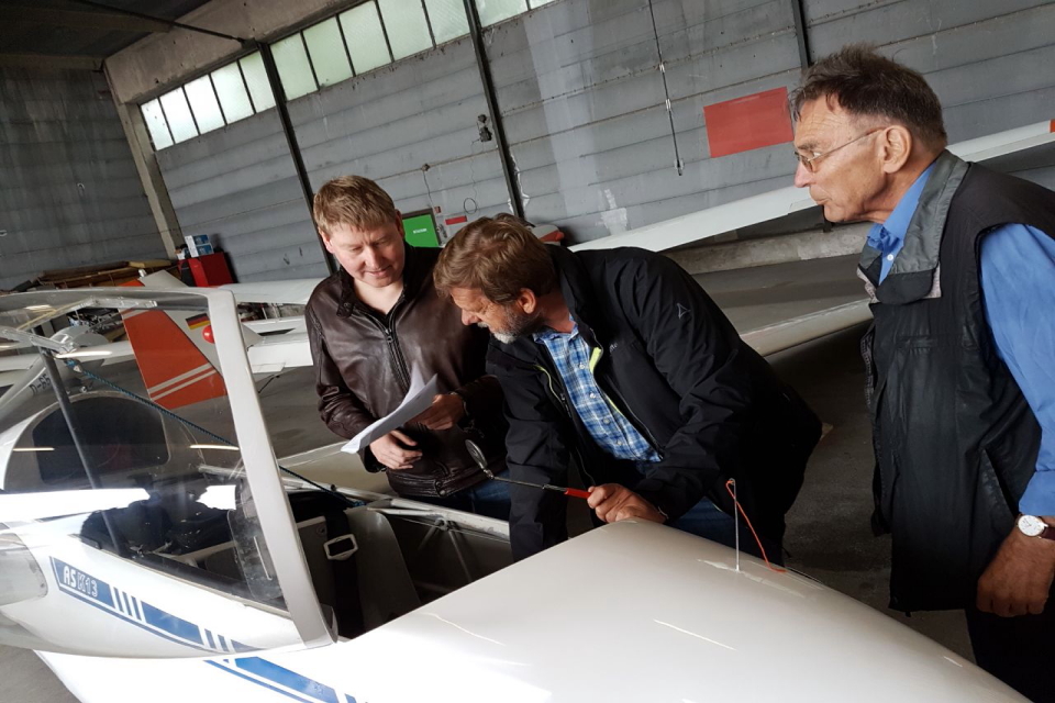 Zur wahrung der Flugsicherheit müssen alle Flugzeuge einmal im Jahr einer Überprüfung unterzogen werden. Dies erledigte unser Prüfer Gerhard am 17.03. mit dem Ergebnis, dass alle unsere Flugzeuge "in Schuss" sind. Auf dem Bild seht ihr wie Prüfer Gerhard und Uwe (Technischer Leiter Segelflug) unsere ASK13 begutachten. Peter (1. Vorsitzender) überwacht das ganze.