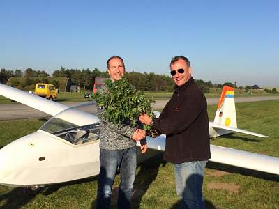 Datei "" in der Kategorie "" nicht vorhandenAlles Gute zum ersten Alleinflug wünschen wir unserem Flugschüler Jörn Tjards. Bei bestem Wetter legte er am 12. Juli drei wunderbare Landungen hin. Herzlichen Glückwunsch! Auf dem Bild ist der stolze Fluglehrer Arndt Deyerling bei der obligatorischen Straußübergabe zu sehen. Bis zum eigenen Segelflugschein darf sein Schützling nun, unter der Aufsicht eines Fluglehrers, eigene Segelflüge in Platznähe durchführen.