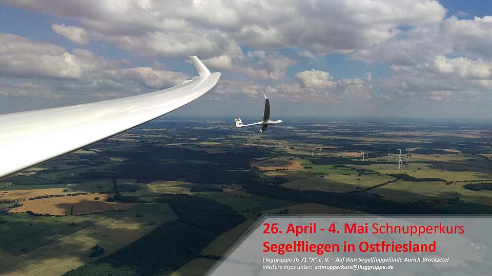 Die Fluggruppe JG 71 "R" e.V. hat am langen Maiwochenende erstmalig seit der Corona-Pandemie wieder einen Schnupperkurs im Segelfliegen durchgeführt. Dazu trafen am Sonnabend 12 Interessierte am Fliegerhorst Wittmundhafen ein, um vom Ausbildungsleiter der Fluggruppe Arnd Deyerling in den theoretischen Grundlagen des Fliegens unterrichtet zu werden. Die Teilnehmer wurden außerdem in die flugbetrieblichen Verfahren eingewiesen. Mittags ging es dann zum Segelflugplatz Brockzetel, wo die Fluggruppe derzeit den Flugbetrieb durchführt. Hier erfolgte der Praxisteil.